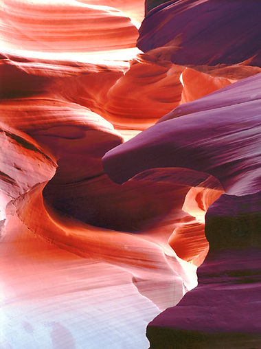 There are remarkable sandstone sculptures in the desert southwest, particularly on and around the Colorado Plateau. This was taken from inside a narrow canyon. In low light situations, the film will often record the color of the reflected light, rather than the color of the rock.
